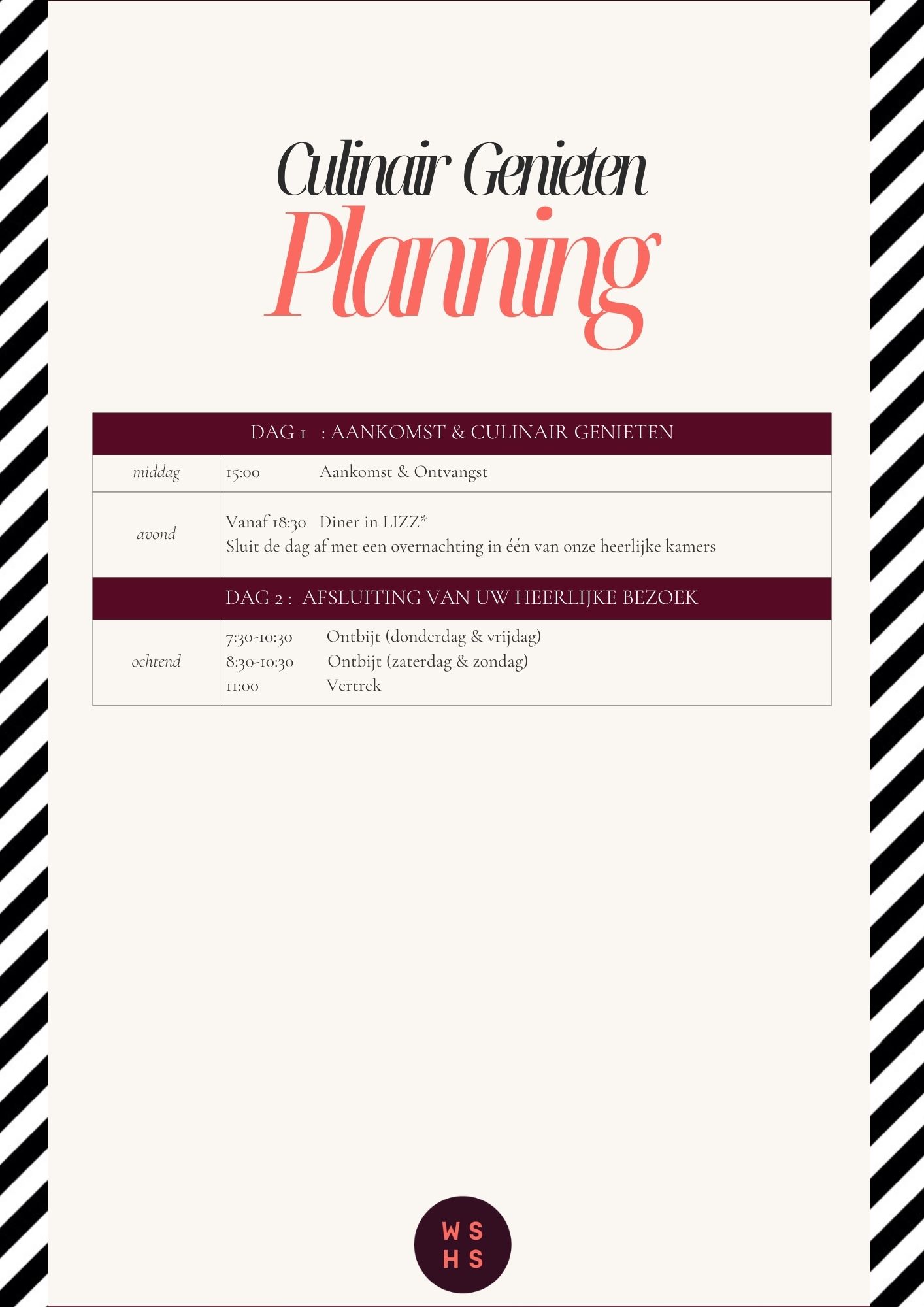 Geniet bij aankomst van een La Vie en Rose ontvangst en ontdek daarna wat Gouda te bieden heeft. Geniet van een 5-gangen menu in fine-dining restaurant LIZZ* inclusief wijn arrangement, met als afsluiting koffie of thee met friandises. Sluit de nacht af in één van onze heerlijke kamers. De volgende dag begint met een uitgebreid ontbijt in de Regentenkamer.